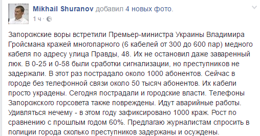 "Запорожские воры встретили Премьер-министра Украины Владимира Гройсмана кражей многопарного (6 кабелей от 300 до 600 пар) медного кабеля по адресу улица Правды, 48. Их не остановил даже заваренный люк. В 0-25 и 0-58 были сработки сигнализации, но преступников не задержали", - написал Шуранов.