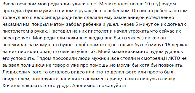 Неожиданно неадекватный мужчина догнал их и начал угрожать пистолетом. Как пишет молодой человек, каким-то чудом женщине удалось его успокоить. Примечательно, что никто из прохожих в конфликт не вмешался и полицию не вызвал.