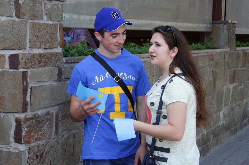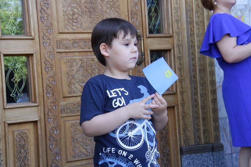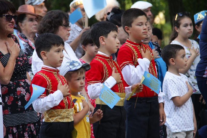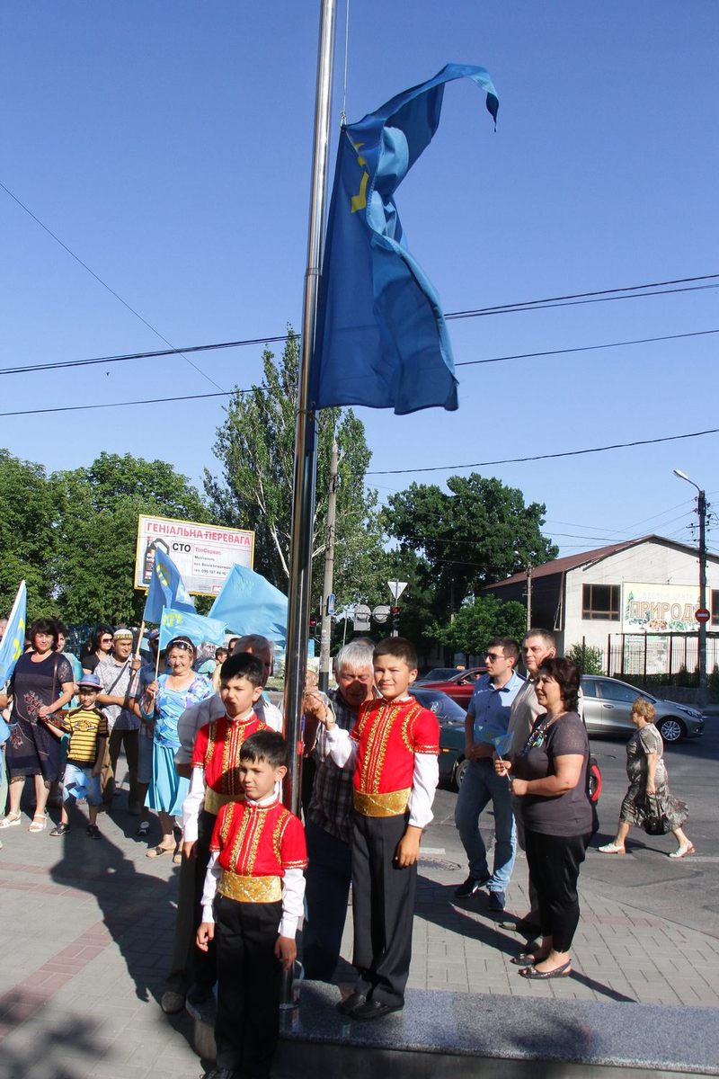 В 17.00 возле кафе "Форос" собрались представители крымскотатарской громады Мелитополя разных возрастов, городской власти, национальных обществ города, активисты. Здесь щедро раздавали всем желающим маленькие голубые флажки с золотой тамгой в уголке - национальный флаг крымскотатарского народа. Когда вся процессия была готова перейти к другой локации - перед центральным входом в парк культуры и отдыха им. М. Горького, под аплодисменты собравшихся три мальчишки в национальных костюмах подняли на флагштоке большой флаг крымских татар.
