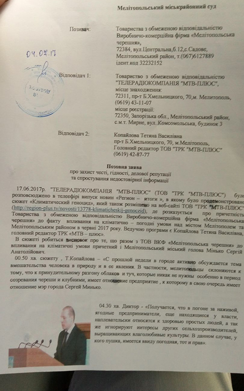 ООО «Мелитопольская черешня» подала в суд иск к телекомпании «МТВ плюс» о защите чести, достоинства, деловой репутации и опровержения недостоверной информации.
