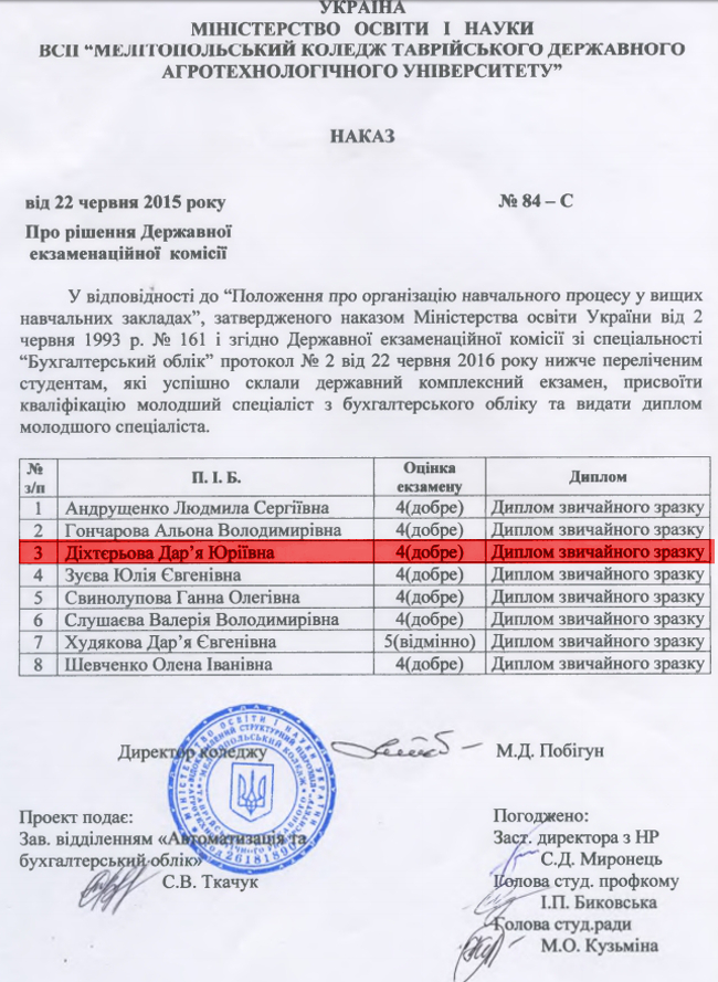 В результате расследования, произведенного местными СМИ, выяснилось, что Дарья Дихтерева, дочь мелитопольского предпринимателя Юрия Дихтерева, владеющего магазином «Детский мир» и рынком «Образцовый», поступила в ВСП «Мелитопольский колледж Таврического государственного агротехнологического университета».