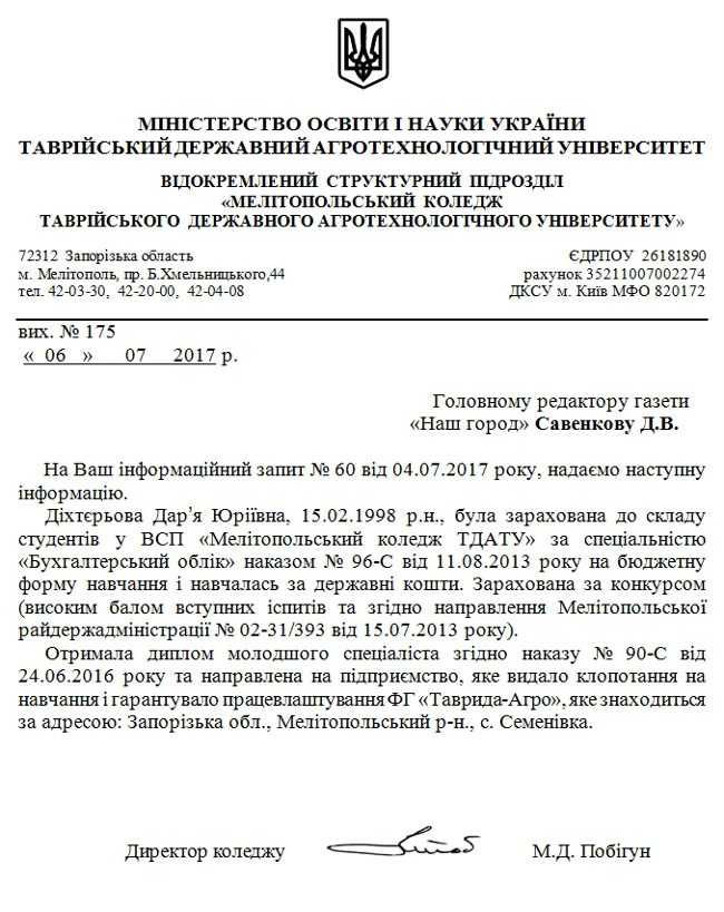 А ведь без нее она не смогла бы получить направление от Мелитопольской райгосадминистрации на обучение в колледже ТГАТУ за государственный счет, что подтверждает и директор колледжа в ответ на официальный запрос журналистов.