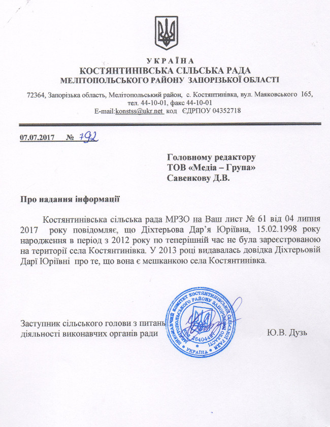 «…Дихтерева Дарья Юрьевна 15.02.1998 г.р. в период с 2012 года по нынешнее время не была зарегистрирована на территории села Константиновка. В 2013 году выдавалась справка Дихтеревой Дарье Юрьевне о том, что она является жительницей села Константиновка».