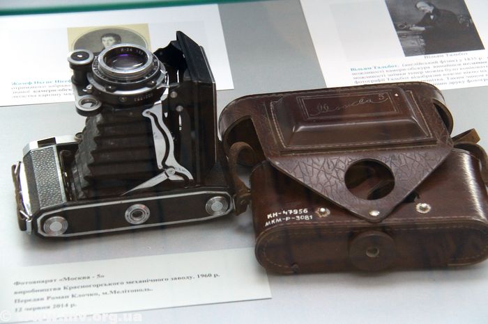 В «Мире старых фотоаппаратов» много экспонатов, на которые стоит посмотреть. Вот маленький аппаратик «Лилипут», производившийся в 1930-х гг. Он принадлежал мелитопольцу В. Сухоруку, видимо, любителю фотографии. В 1941 г. он ушел на войну и не вернулся. Перебирая его вещи, сестра Сухорука нашла этот интересный фотоаппарат и отдала в краеведческий музей. А самым большим экспонатом на выставке является крупноформатный студийный фотоаппарат-гармошка. Смотришь на него, и кажется, что сейчас фотограф, накинув на голову темную ткань, скажет: «Внимание! Сейчас отсюда вылетит птичка!». Фотоаппарат-гармошка выглядит таким древним, хотя, как отметила О. Беца, в документах написано, что год его выпуска... 1976. Вот какими семимильными шагами развивается фототехника!..