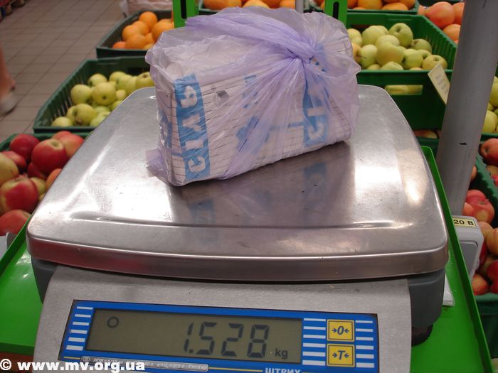 Мы решили проверить, не обманывают ли покупателей на Центральном рынке Мелитополя. Для этого мы приобрели пачку обычной кухонной соли массой (нетто) 1500 г, и с этой упаковкой прошлись по рынку, просясь взвесить свое «добро» у торгующих. Большинство проверенных нами мерил показали вес в пределах 1530-1538 г.