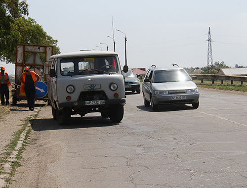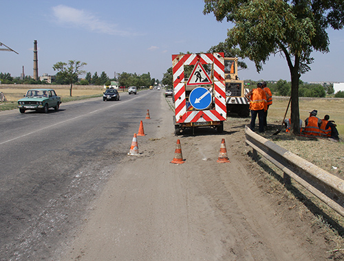 Сегодня на выезде из Мелитополя по направлению к с. Константиновка Мелитопольский ДЭУ проводит дорожные работы – собирает с обочин землю и готовит ограждения к покраске.