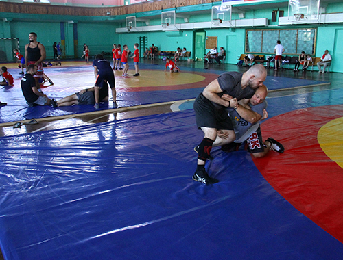 На первой тренировке мы заметили известного мелитопольского борца Гора Оганесяна. Как рассказал Гор, 26 августа в Париже стартует чемпионат мира по вольной борьбе среди взрослых. Он готовится выступать на этом мировом чемпионате. Гор недавно вернулся со сборов в Карпатах и уже 7 августа отправляется на заключительные сборы национальной украинской команды. А эти несколько дней проведет здесь, поработает над ошибками, поспаррингует с американскими борцами. "Это интересно и полезно, это новая школа вольной борьбы, новые для нас традиции", - сказал Г. Оганесян.