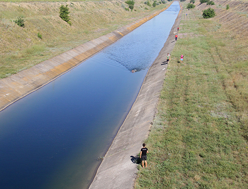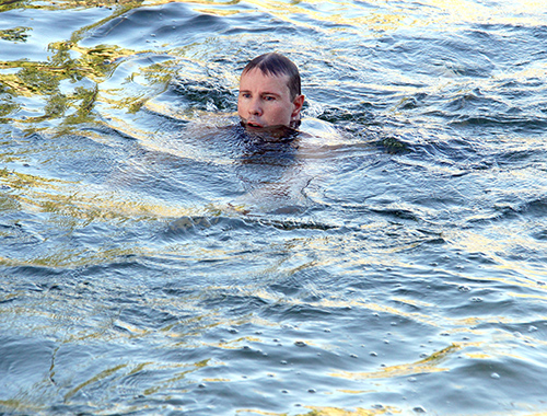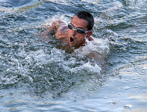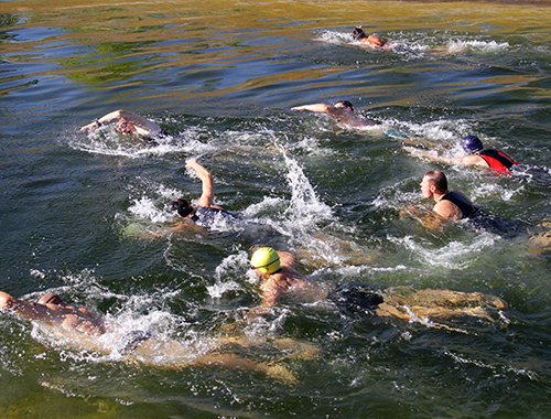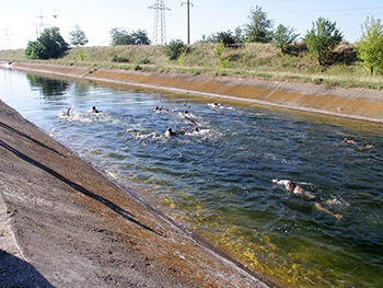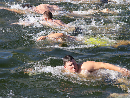 Первый этап соревнований - плавание на 1500 метров. Сначала в воду оросительного канала нырнули и поплыли участники индивидуального зачета, через пять минут был дан старт командным пловцам. Обогнал "индивидуальщиков" и с большим отрывом вырвался вперед пловец команды "Мирненская". Он показал феноменальный результат на финише - 18 мин 5 сек. Вторым приплыл №7 в индивидуальном зачете Артем Мамин. Его результат - 31 мин 42 сек. Следует отметить, что городской голова Мелитополя Сергей Минько, инициатор и организатор "Турнира поколений", приплыл в первой пятерке.