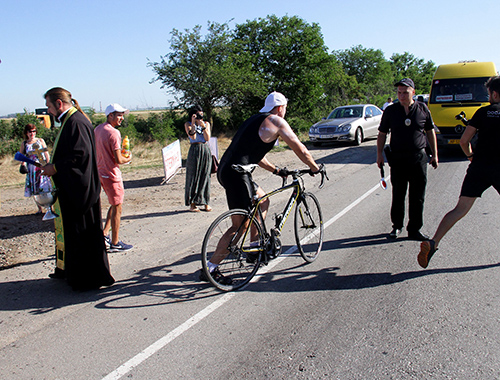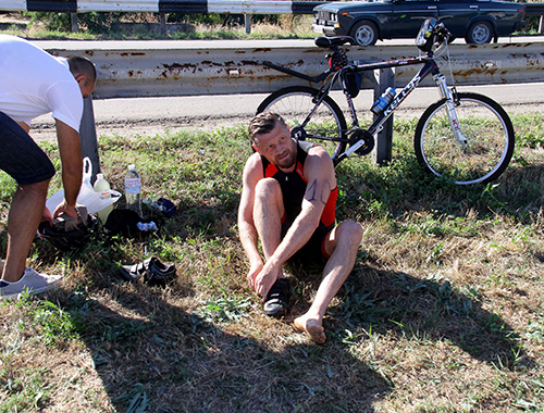 Спортсмены в индивидуальном зачете тут же садились на велосипеды и уходили по маршруту велокросса на 40 км. Участники в командном зачете стартовали все вместе. Финиш велосостязаний их ждет в Сосновке (Мелитопольский район). Там же состоится и третий этап соревнований - бег на 10 км.