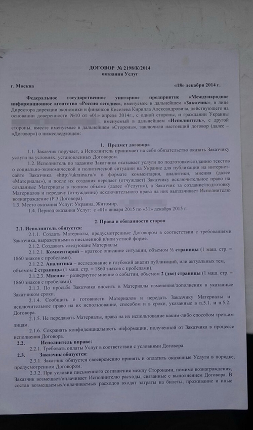 "Житомирский журналист с 2014 года по заказу руководства пропагандистских государственных российских информагентств создавал тенденциозные публикации. Тематику и желаемое содержание материалов он получал по почте или на мессенджер, иногда "информационному наемнику" разрешалось самому выбирать тему", – заявляет служба.