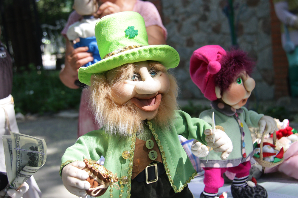 - Это лепрекон – хозяин золота. Этот персонаж ирландского фольклора почему-то наделяют отрицательными качествами. Но мои лепреконы все добрые, потому что сделаны с любовью и несут человеку добро и любовь, - знакомит меня с «зеленым человечком» мастерица-кукольница Евгения Чурилова.