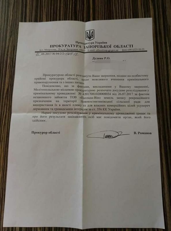 Мелитопольский активист Роман Дудник неоднократно обращался в контролирующие инстанции с требованием прекратить незаконный сбор денег. Но везде получал отказ. Мол 3,5 га пляжной зоны с 2007 года находится в аренде у фирмы ООО "Падала Він". Всего владелец фирмы - некий Отрошко арендует 7,0008 га земли, находящейся в собственности Новоконстантиновского сельсовета Приазовского района. Не удавалось убрать шлагбаум и другим активистам.
