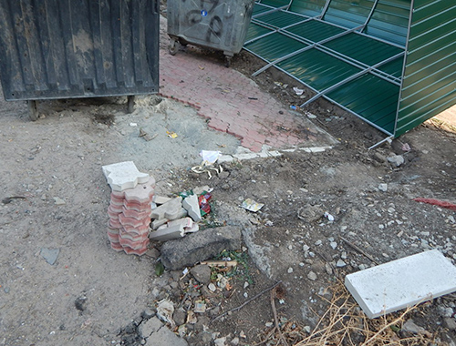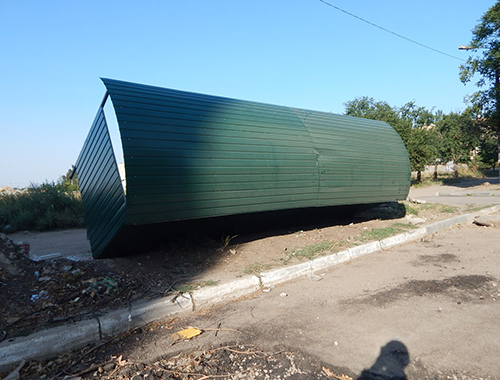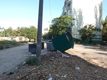"Коротко о том, как у нас всё делают: на Новом Мелитополе стояла нормальная площадка для мусорных баков, разве что крыши не было, но там всегда ветер дул и всем норм было (вони не было), её решили поменять, сделали тяп-ляп, а точнее не забетонировали её вообще - просто вставили в землю сантиметров на 5 - 10, и вот при первом же порыве ветра (до этого как раз безветренно было) её сдуло, плитку вырвало - благо люди не стырили (по крайней мере пока-что), а пособирали её и сложили аккуратно.