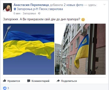 В честь национального праздника запорожцы активно делятся в соцсетях своими селфи с национальным знаменем, а также поздравлениями.