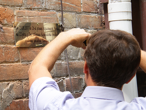 Как сообщалось и в письме, чести заложить капсулу времени удостоилась именинница Марина Гайдаенко. О том, что в конкретном месте замурована капсула, гласит табличка.