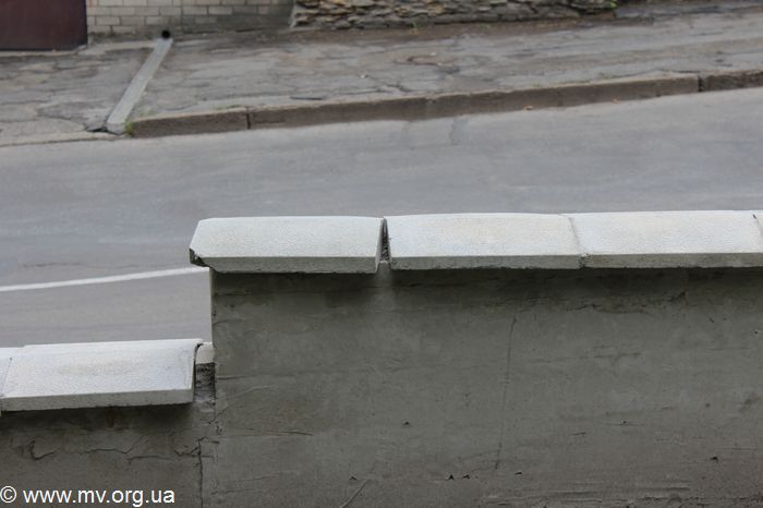 Больших разрушений, конечно, не наблюдается. Кусочек плитки отвалился только в одном месте. А вот цементные козырьки подпорной стены уже разрушены (или кем-то оторваны) сразу в нескольких местах.
