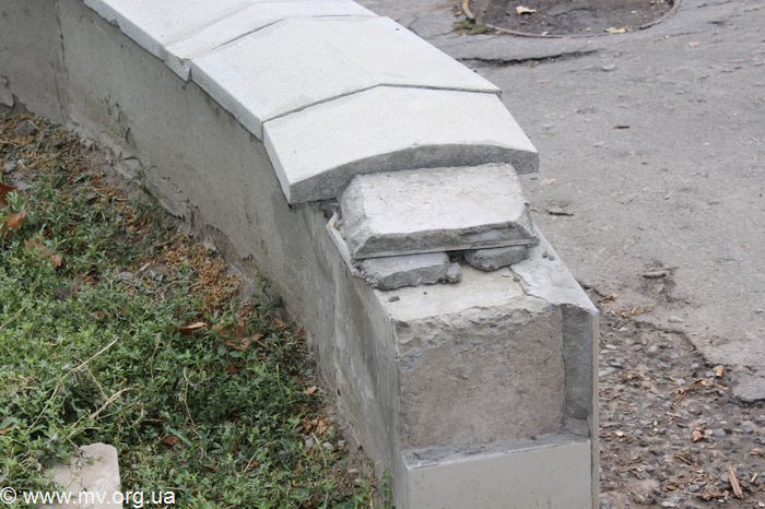 Напомним, что на ее обустройство из городского бюджета было выделено 535 тыс. грн. Подрядная фирма, ООО "Сейм", вела работы в холодное время года, но дала гарантию на свою работу. Мол, в бетон добавлены специальные скрепляющие материалы. И действительно, стенка не падает, а вот ее "наряд" начинает потихоньку валиться.