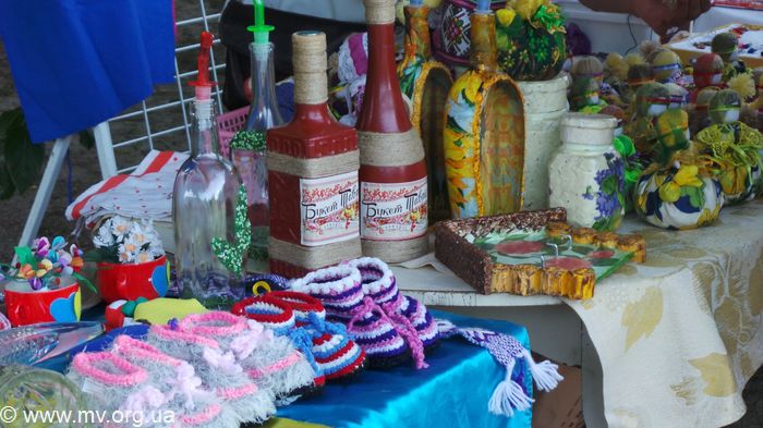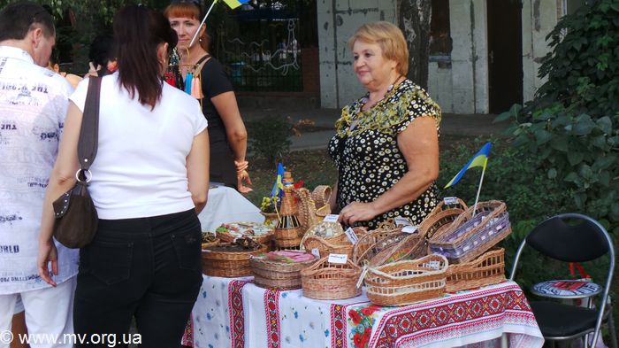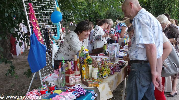 Тем временем на площади вокруг фонтана расположилась ярмарка изделий ручной работы - игрушки, бижутерия и иная мелочь для украшения дома или квартиры. Рядом ещё одна ярмарка, благотворительная. Здесь кроме изделий хенд-мейд продают также домашнюю выпечку. Средства, собранные на этой ярмарке, будут переданы воинам АТО на передовую. Вместе с деньгами туда отправиться и маскировочная сетка, которую недалеко от Летней эстрады плетут волонтеры.