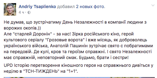 Уроженец Запорожья российский актер Анатолий Пашинин вот уже месяц воюет в зоне АТО.