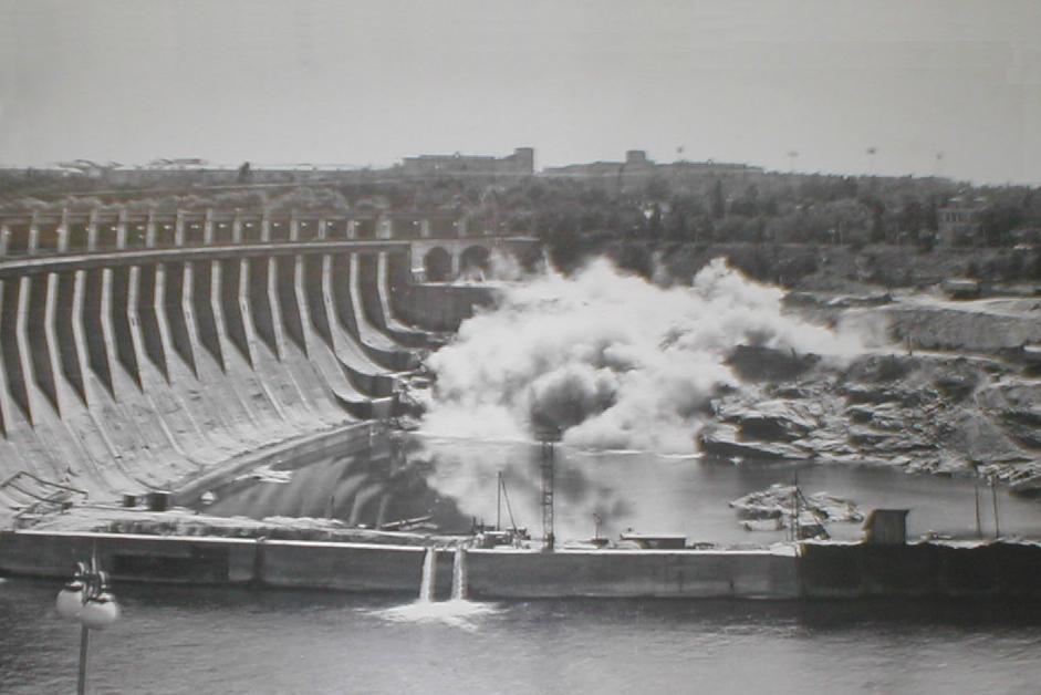 По мнению областных историков, это была спецоперация НКВД. О ней не знали ни жители Запорожья, ни военное командование. Советские войска, отступая под натиском гитлеровских танков и мотопехоты, взорвали плотину Днепрогэса. Мощный взрыв прогремел около восьми вечера. Для подрыва плотины было заложено 20 тонн аммонала, который доставили из Москвы двумя самолетами. Также были сожжены генераторы станции и затоплен машинный зал. Пробоина в плотине спровоцировала огромную волну. Двигаясь вниз, она уничтожала целые села в пойме Днепра, переворачивала корабли. Бронированный артиллерийский корабль «Волочаевка» выбросило далеко на сушу.