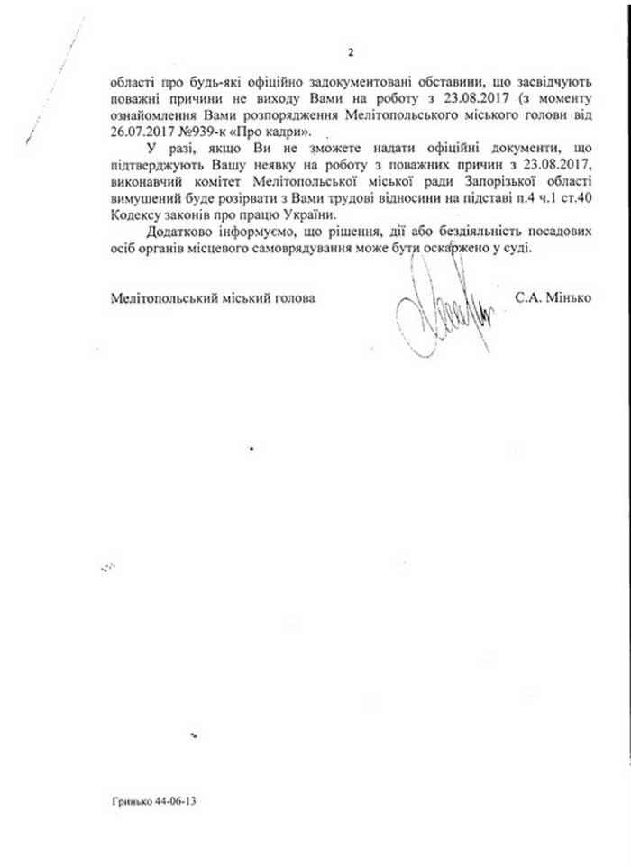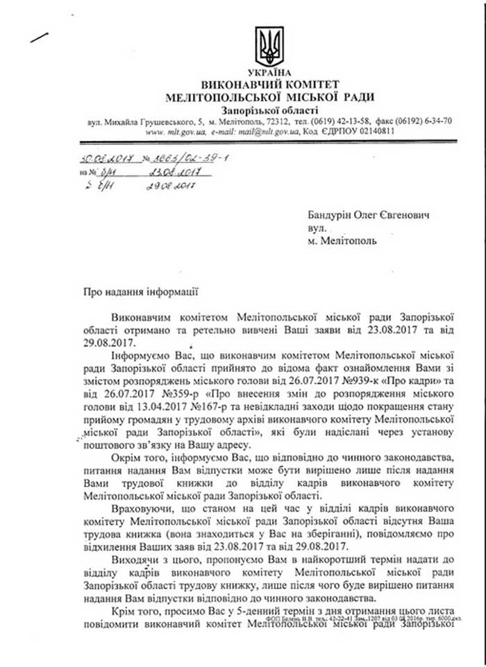 "До виконавчого комітету Мелітопольської міської ради надійшли дві заяви про надання відпустки Бандуріну О.Є. від 23.08.2017 та від 29.08.2017. Заступник міського голови Бандурін О.Є. вже більше місяця з моменту поновлення його на посаді (з 26.07.2017 року) з невідомих причин не виходить на роботу, не з'явився у відділі кадрів, трудова книжка продовжує знаходитися у нього на зберіганні, будь-які засоби зв'язку з ним відсутні.