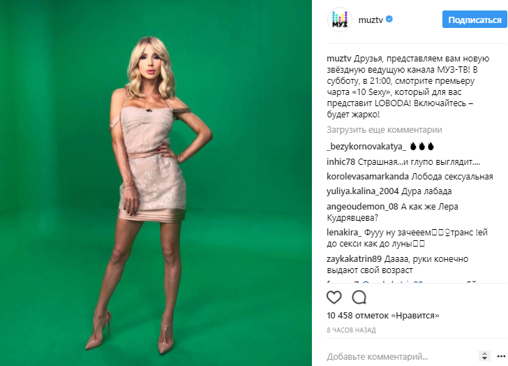 «Друзья, представляем вам новую звёздную ведущую канала МУЗ-ТВ! В субботу, в 21:00, смотрите премьеру чарта «10 Sexy», который для вас представит LOBODA! Включайтесь — будет жарко!» — сказано в сообщении.