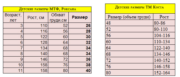 Таблица детских размеров