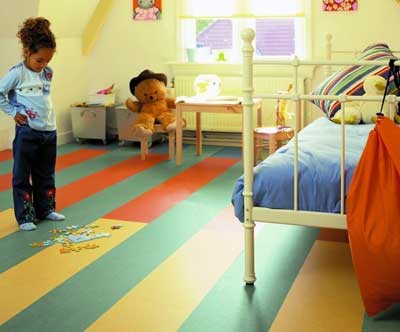 Плитка ПВХ, или виниловая плитка, - материал прочный, легкий в укладке, недорогой. Виниловая плитка может быть самоклеящейся - ее легко монтировать самостоятельно. Хотя для детской комнаты лучше все же выбрать покрытие, которое будет особенно надежно закреплено на основе. Пол в детской комнате, состоящий из виниловой плитки, легко ремонтировать - поврежденные элементы вырезаются из покрытия и заменяются новыми. Ввиду этого приобретайте чуть больше материала - про запас.
