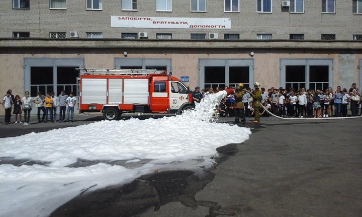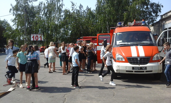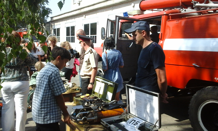 На площадке был организован показ пожарно-спасательной техники, где все желающие могли познакомиться поближе с работой спасателей. Спасатели рассказали о технических характеристиках специальных автомобилей и в каких чрезвычайных ситуациях они применяются. Школьников ознакомили с боевым снаряжением и техническим оборудованием спасателей. Мальчики и девочки осмотрели машины снаружи и изнутри и сфотографировались в настоящей боевой одежде спасателей.