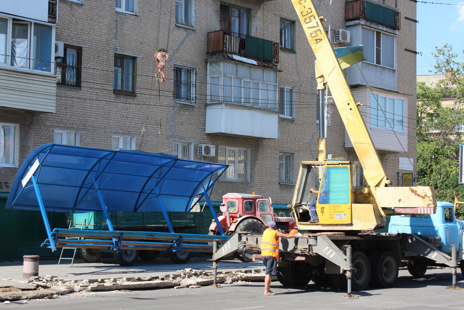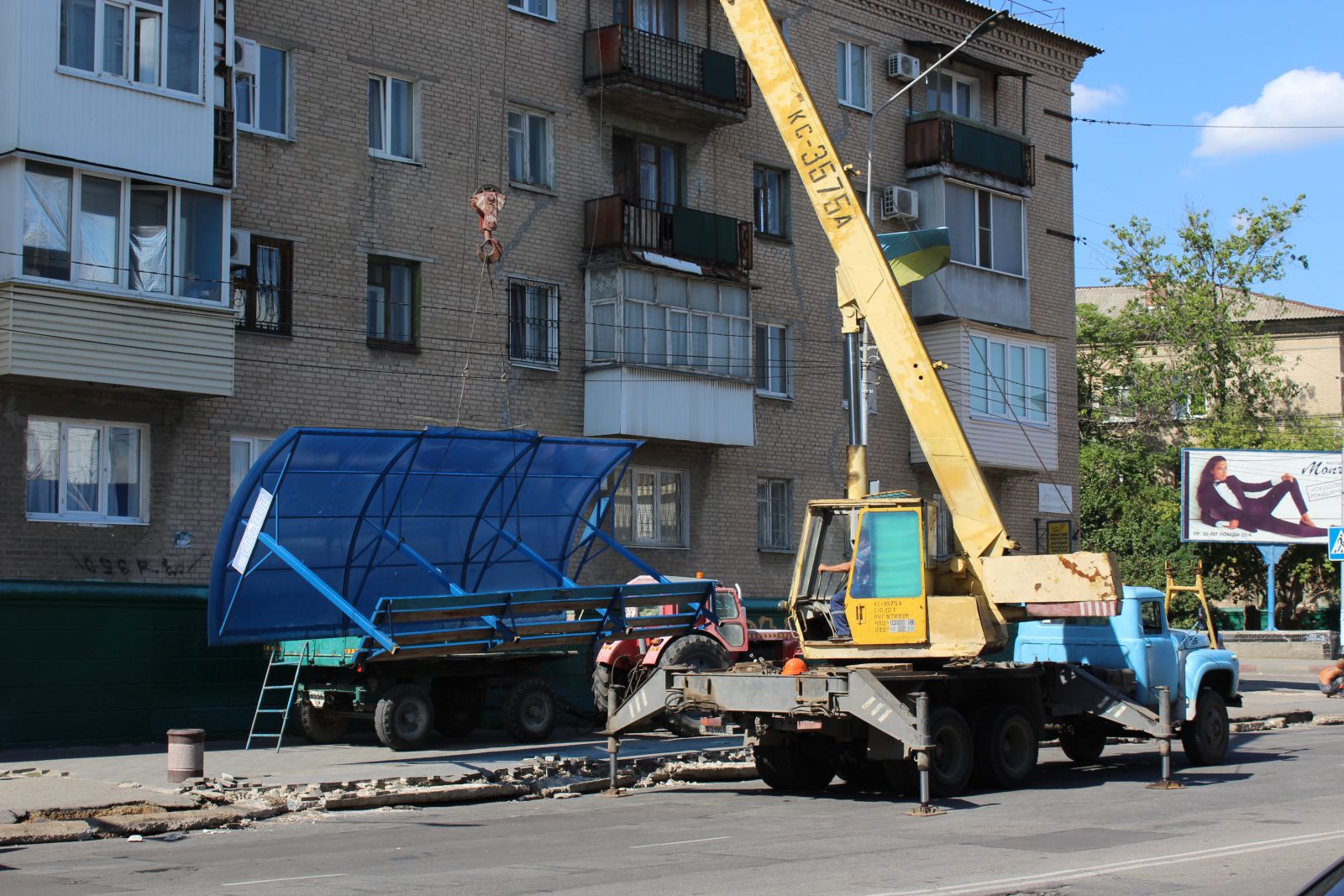 На остановке "Луначарского" на пр. Б. Хмельницкого коммунальщики демонтируют остановочный комплекс, когда-то установленный за средства частного предпринимателя.