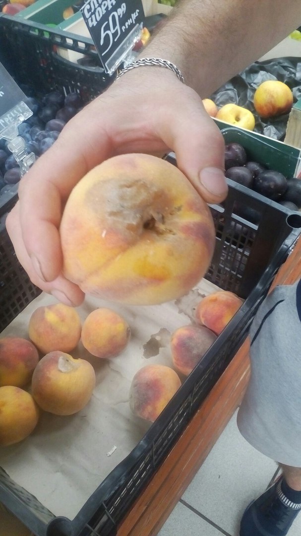 На сей раз, на прилавке супермаркета покупатель обнаружил гнилые фрукты. Вид у продуктов явно не товарный. Но с прилавка некондицию убирать работники супермаркета не спешили. И также стоит заметить, что фрукты не относились к разряду уцененных.