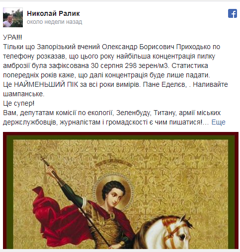 "Запорожский ученый Александр Приходько с ежегодной традицией измерял концентрацию пыльцы в воздухе. В этом году самая большая его концентрация была зафиксирована 30 августа 298 зерен / м3. Статистика предыдущих лет говорит, что дальше концентрация будет только падать. Это наименьший показатель пиковой цветения за все годы мониторинга", - пишет Ралик.