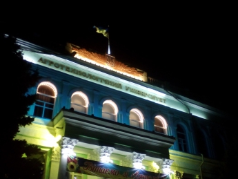 К 85-летию вуза центр его главного корпуса в темноте светится голубыми и желтыми красками.