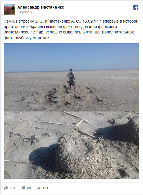 В свою очередь, украинский орнитолог Александр Настаченко сообщил в Facebook, что 13 пар фламинго свили гнезда в Украине и успешно вывели троих птенцов. Настаченко опубликовал соответствующие снимки.