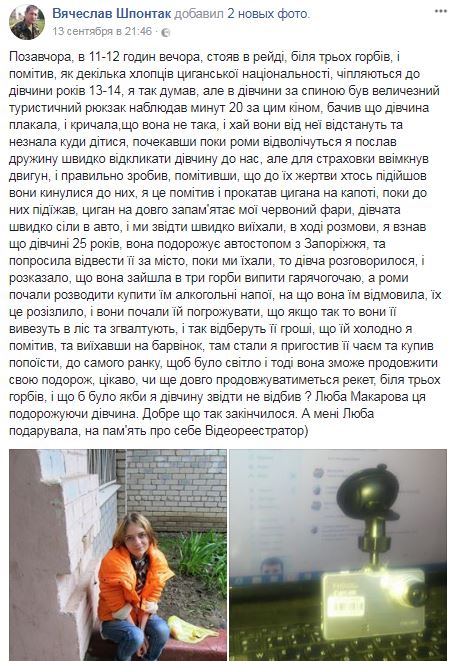 В прошлый понедельник, 11 сентября, около 23:00 возле заведения "Три холма" в Ужгороде местный активист Вячеслав Шпонтак заметил, как несколько парней ромской национальности пристают к девушке с туристическим рюкзаком. Последняя плакала и говорила, что она "не такая".