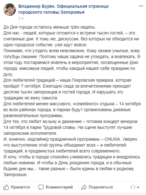 Об этом на своей странице в Фейсбук сообщил запорожский мэр Владимир Буряк.