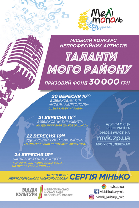 Завтра, 20 сентября начинается отбор талантливых мелитопольцев - участников городского конкурса непрофессиональных артистов "Таланты моего района". Призовой фонд конкурса - 30 000 грн.