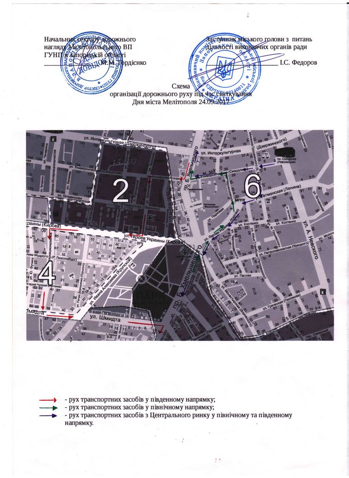 24 сентября с 08.30 до 10.30 будет перекрыто дорожное движение по проспекту Б. Хмельницкого (на промежутке от ул. Интеркультурная до ул. Университетской) и по ул. Интеркультурная (на промежутке от ул. Чернышевского до проспекта Б. Хмельницкого) для построения торжественной театрализованной колонны коллективов города Мелитополя, транспорт будет двигаться в южном направлении с пр. Б. Хмельницкого - ул. Интеркультурной (бывшая ул. Дзержинского) остановка возле универмага "Солнечный" - ул. Петра Дорошенко (бывшая ул. Горького) - ул. Героев Украины (бывшая ул. Кирова) ближайшая остановка "ул. Героев Украины "- по ул. Воинов-интернационалистов - ул. Шмидта ближайшие остановки "Поликлиника" (напротив интерната), "Поликлиника" (около Мелитопольской районной государственной администрации) - пр. Б. Хмельницкого ост. "Ул. Шмидта ". В северном направлении транспорт будет двигаться пр. Б. Хмельницкого ближайшие остановки "Детское питание" и у кафе "Челентано" - ул. Героев Украины (бывшая ул. Кирова) ост. "Педагогический университет" - ул. Гетманскую (бывшая ул. Ленина) - ул. Михаила Грушевского (бывшая ул. Карла Маркса) - ул. Гетмана Сагайдачного (бывш. Фрунзе)