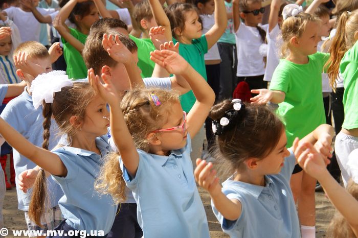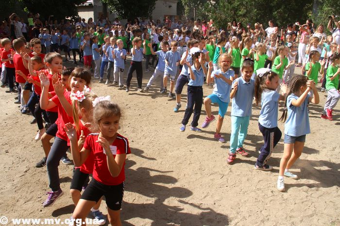 В завершении небольшого концерта, к веселью присоединились все ученики. Около 150 ребятишек приняли участие в флешмобе, ритмично двигаясь под музыку.