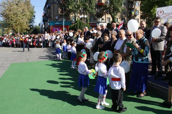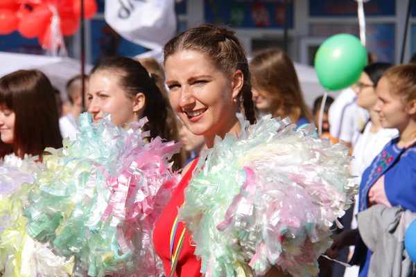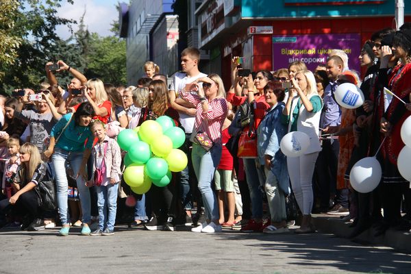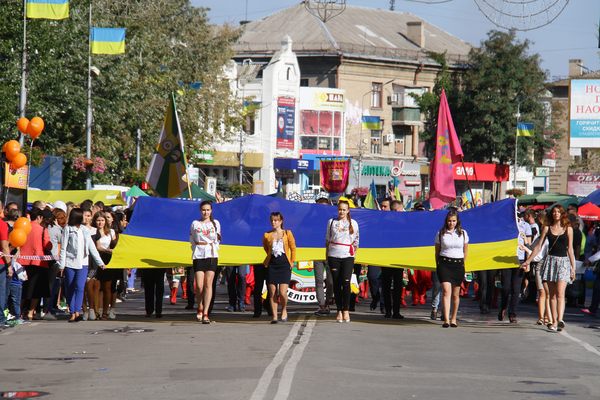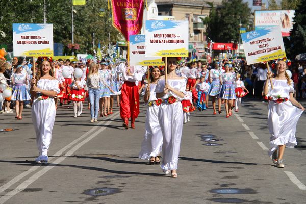 Постепенно колонна продвигается вперед, к площади Победы, где каждый коллектив-участник делает короткое выступление. Здесь, вокруг памятника Кобзарю, широким кругом стоят зрители и смотрят эти выступления юных земляков. Ведущий как раз объявляет: «А зараз – Мелітопольське училище культури! Вони цього року перемогли в багатьох конкурсах…». Пока он перечисляет их заслуги, студенты исполняют танец. Выступившие коллективы проходят вперед, к перекрестку проспекта с улицей Героев Украины. Тут уже расположились столики, за которыми можно перекусить жареными колбасками с пивом. Палатка с надписью «Сладкая вата, попкорн» вызывает улыбку у прохожего, который бормочет: «Оказывается, вата бывает сладкой!». Многие палатки торгуют овощами и фруктами, причем приехали они не только из Мелитопольского района, но и из других регионов Украины. «Почем груши, девушка?» – «Эти по 10, те – по 20. Берите, хорошие груши, Филипповские!».
