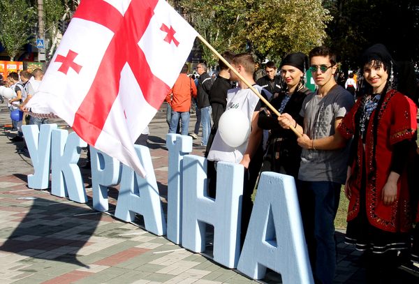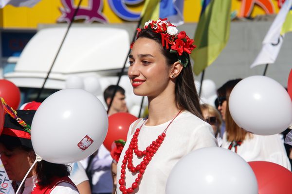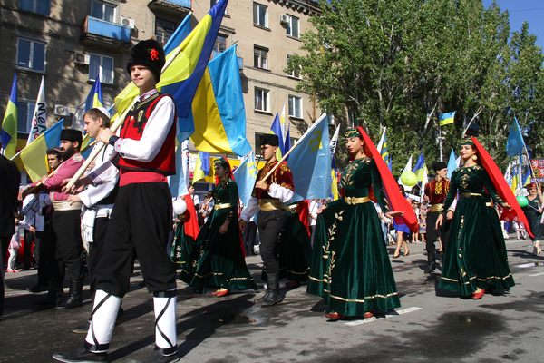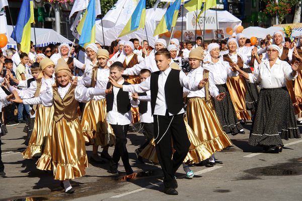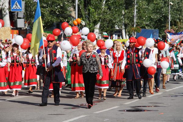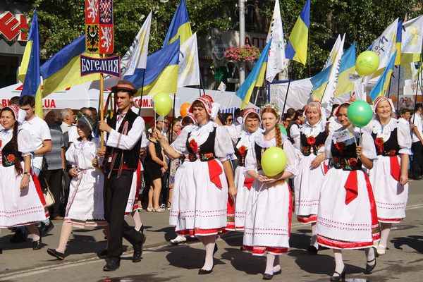 Выступившие проходят и затем, через площадь, идут мимо ДК им.Т.Шевченко. Многие идут в концертных костюмах – вот спешат женщины пенсионного возраста в старинных немецких костюмах, а вместе с ними спешат молодых ребята с крымско-татарским флагом и в старинных костюмах. А из ДК им навстречу идут парни в грузинских национальных костюмах с кинжалами на боку. Здесь же, у фонтана, разворачивают свои столики национальные общества: вот столик с вышивкой «Беларусь ты моя синеокая!», чуть далее армяне разворачивают свой флаг, а за ними евреи в белых шапочках на макушке ставят свой столик. Пока одни что-то ставят, две молодые смуглые девушки в ярких цыганских костюмах фотографируются на телефон в фотозоне.