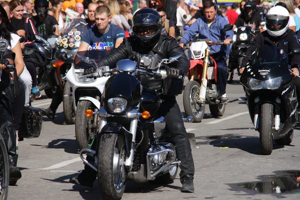 Байкеры стоят в конце колонны и громко сигналят. Их душа просит скорости, но им приходится дожидаться в конце колонны, чтобы завершить своим проездом Торжественное шествие по проспекту им.Б.Хмельницкого, посвященное Дню города Медитополя-2017. Несколько девушек прижались к своим парням-байкерам, и с лучезарной улыбкой глядят по сторонам.