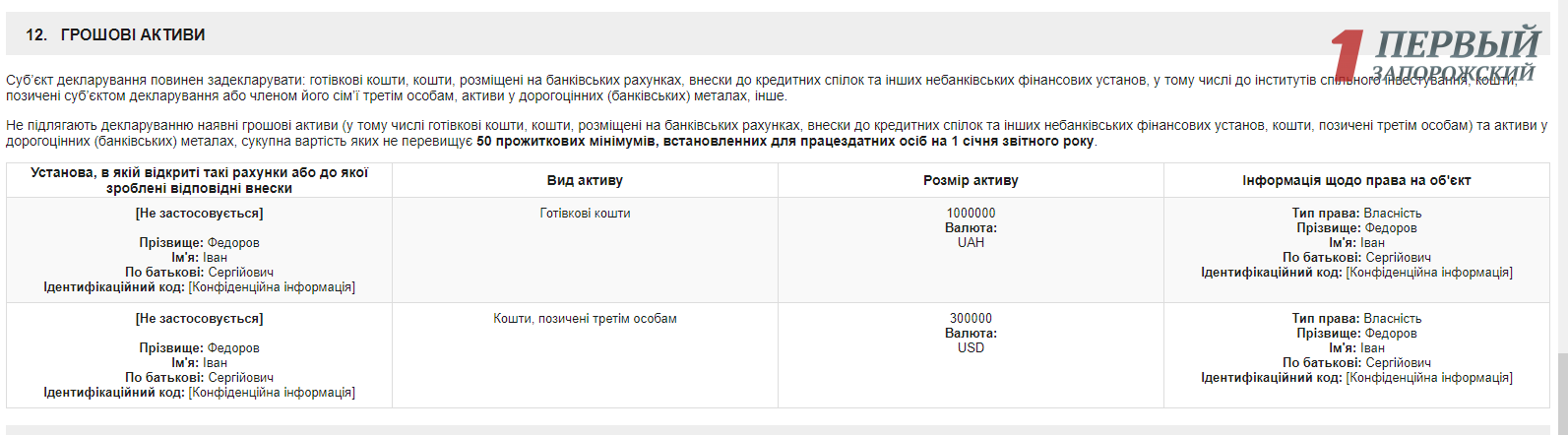 Из недвижимости у Ивана Федорова также есть жилой дом в Запорожье за полтора миллиона гривен, земельный участок на пять соток и квартира родственников в Мелитополе на 63,1 квадратных метра.