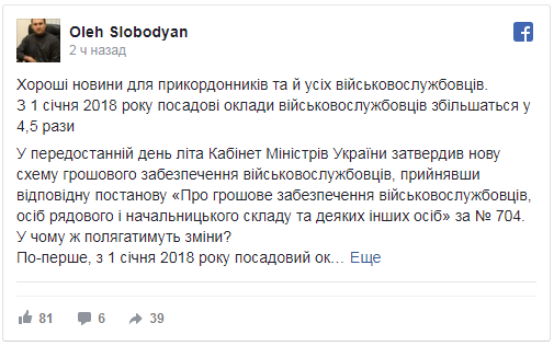 "Хорошие новости для пограничников и всех военнослужащих. С 1 января 2018 года должностные оклады военнослужащих увеличатся в 4,5 раза", - пишет он.