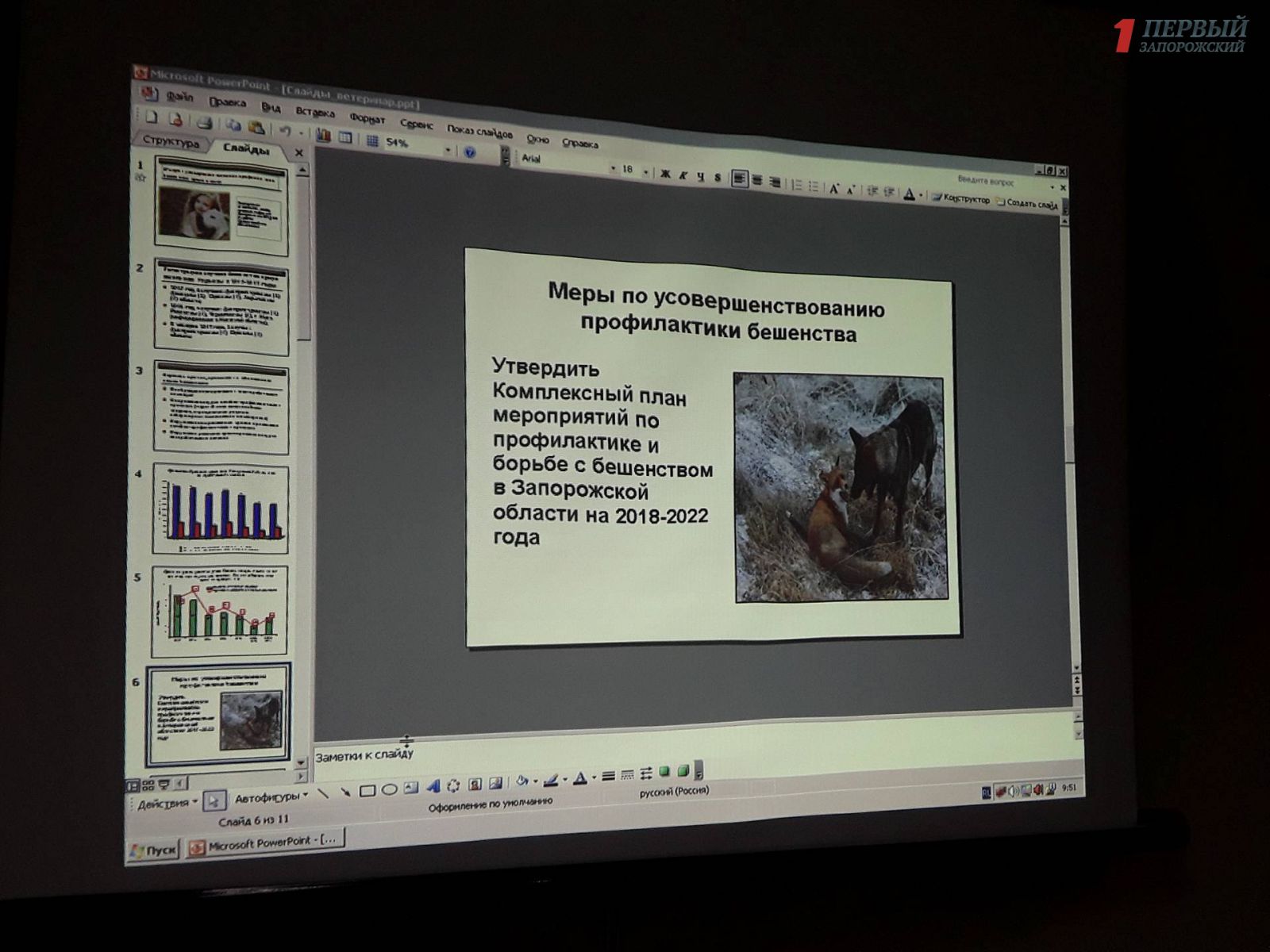— Самая сложная ситуация сложилась в Михайловском, Бильмацком, Пологовском, Ореховском, Веселовском, Каменко-Днепровском и Великобелозерском районах. На этих территориях зарегистрировано от пяти до девяти больных бешенством животных. Ситуация напряженная и требует комплексного осуществления мероприятий всеми причастными службами, — отметил начальник ГУ Госпродпотребслужбы в Запорожской области Виктор Шершнев.