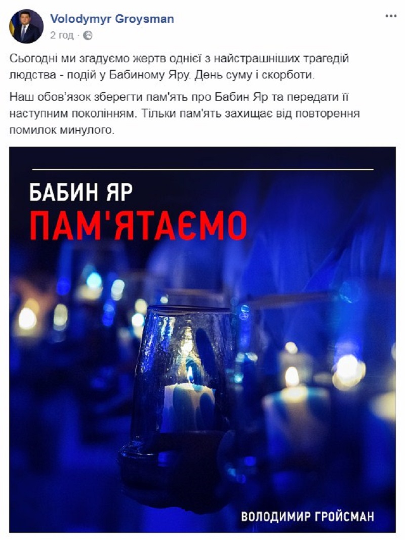 Премьер-министр Украины Владимир Гройсман отметил, что память о трагедии Бабьего Яра необходимо сохранить и передать следующим поколениям для недопущения повторения ошибок прошлого.