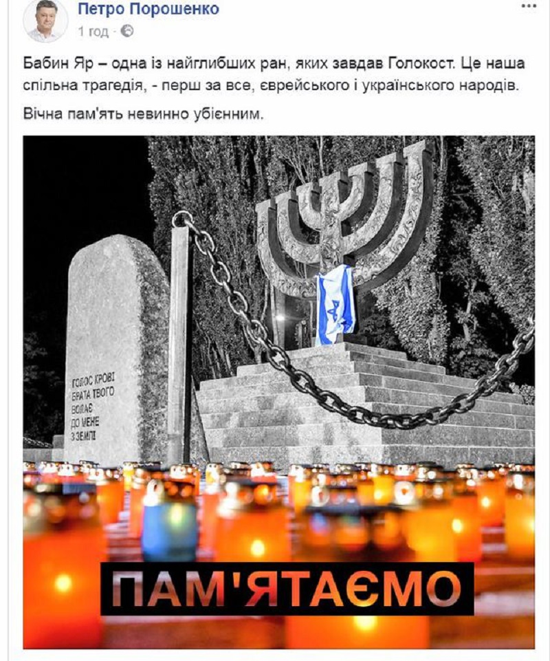 Глава государства на своей странице в Facebook написал: «Бабий Яр - одна из самых глубоких ран, которые нанес Холокост. Это наша общая трагедия - прежде всего, еврейского и украинского народов. Вечная память невинно убиенным».