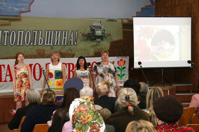 Какой же праздник без песни? Поэтому между награждениями и выступлениями для собравшихся спел песню Сергей Хилько, также исполнила народную песню Наталья Чабанова. Но окончательно «порвали зал» веселые песни от народного ансамбля народной песни «Калинонька» Вознесенского ДК (руководитель Татьяна Беляева). Исполнять шутливые песни тяжело, но если это делаешь умело, зал будет счастлив, что им и удалось! Все собрались на праздник, и они его получили - сначала заулыбавшись, потом засмеявшись, а затем и сбив ладони, хлопая песням, исполненным этим коллективом под баян!