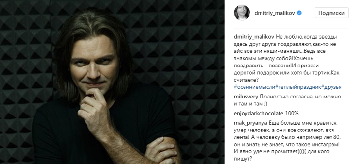 "Не люблю,когда звезды здесь друг друга поздравляют, как-то не айс все эти няши-маняши... Ведь все знакомы между собой! Хочешь поздравить - позвони! И привези дорогой подарок или хотя бы тортик. Как считаете?" - написал он.