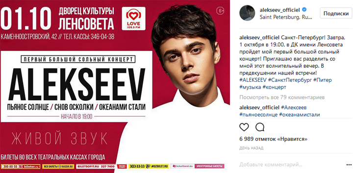 Молодой украинский поп-исполнитель Никита Алексеев (Alekseev), который недавно победил сразу в трех номинациях на российской Top Hit Music Awards 2017, дал первый сольный концерт в РФ. Выступление состоялось в воскресенье, 1 октября, в Санкт-Петербурге.